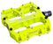 Bicycle Pedals Reverse Components Escape Neon - Yellow Aluminium with 5mm pins The classic flat pedal Through its robustness and its countless colour variations, it is used and appreciated by mountain bikers worldwide. If you look around at your next visit to a European bike park you will certainly discover some ESCAPE pedals! Our in house name for the Escape is "THE Bike Park Pedal" because it is almost impossible to crack the body of the pedal. We often get pedals for service on bearings and axle, where you can see the abuse over the years. Despite countless contacts with stones and roots, the ESCAPE pedal remains sturdy and riders have had years of use of out pairs of these pedals. The combination of steel and aluminium pins, spread over a generous 10 cm by 10 cm pedal body, provides an incredibly good grip, as well as a safe stand on the pedal! Because this fact is just as important as the traction between the wheels and the ground. Replaceable pins, the anti-rotate function” which prevents the pedal from spinning, if you have to get your foot off the pedal in tight switchback manoeuvres, the very fair price-performance ratio and not least huge colour variations contribute to the success of the ESCAPE pedal. Safety note: Unless otherwise specified by the crank manufacturer. Make sure that the pedals are tightened to min. 37 to max. 42 Nm. - Pedal size: 100 x 100 mm - Height: 16 mm - Pedal thread: 9/16" - Bearings: 1 x industrial bearing / 1 x IGUS DU bushing - Pin Setup: 16 steel pins (self-threatening) / 8 aluminium pins - Pin height: 5 mm above the pedal - Weight: 405 g (+/- 5% weight tolerance) - Material: Aluminium 6061